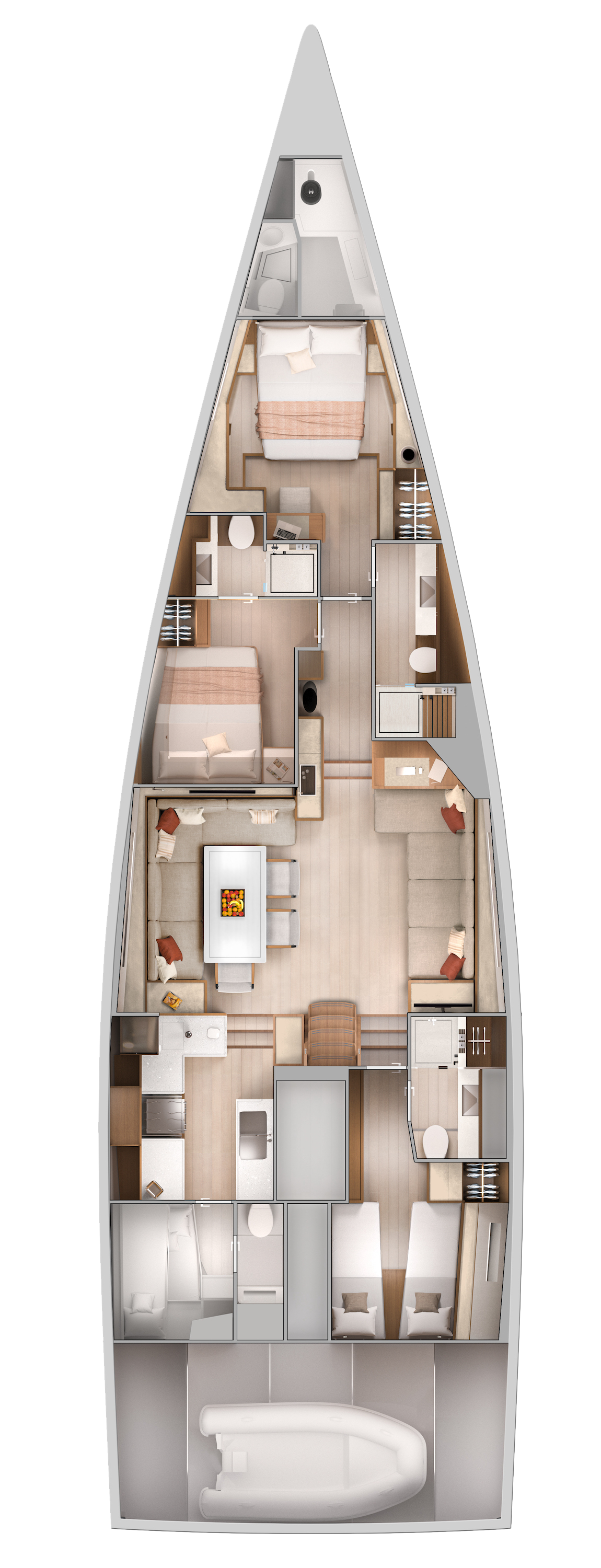 Every cabin is air-conditioned and supplied with premium toiletries, ensuring a comfortable and effortless stay.Below deck, the salon and dinette provide a welcoming and spacious area for guests to relax, dine, or socialize. The lounge features comfortable seating and a dining table, creating an inviting environment for intimate gatherings. Large windows around the upper part of the salon fill the space with beautiful natural light, enhancing the airy and open atmosphere. The yacht’s fully equipped kitchen is discreetly located nearby, allowing the crew to prepare meals efficiently while maintaining the guests’ privacy
